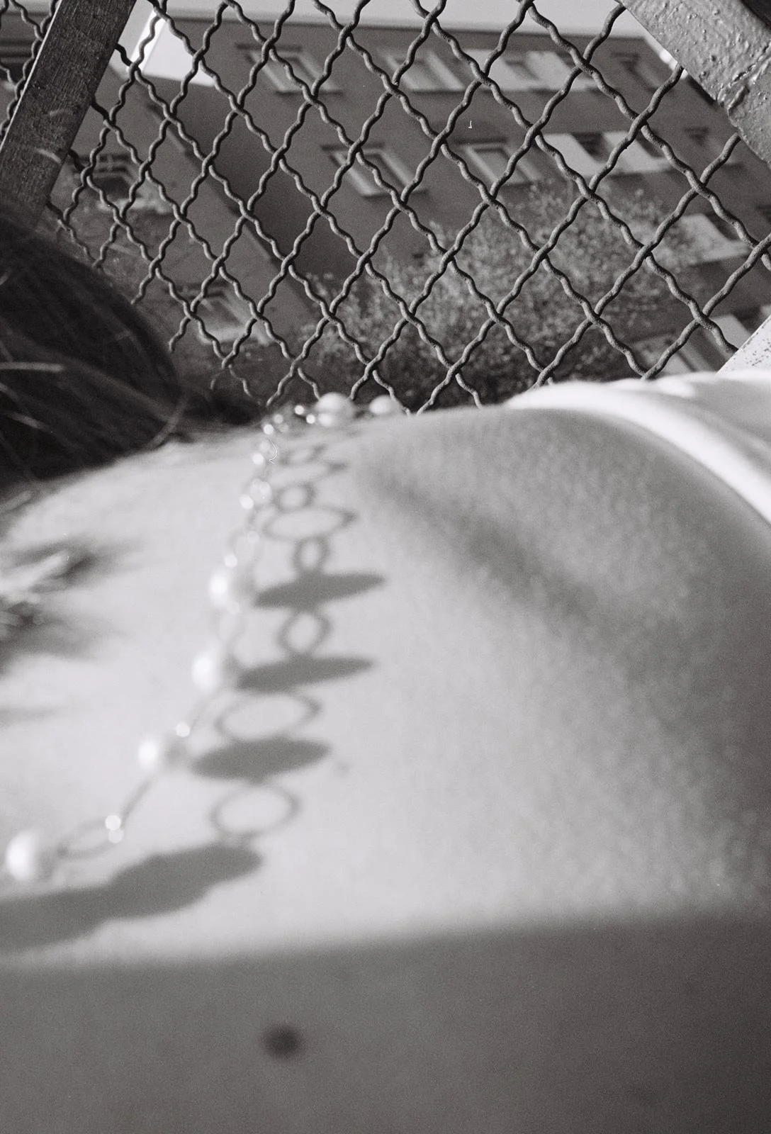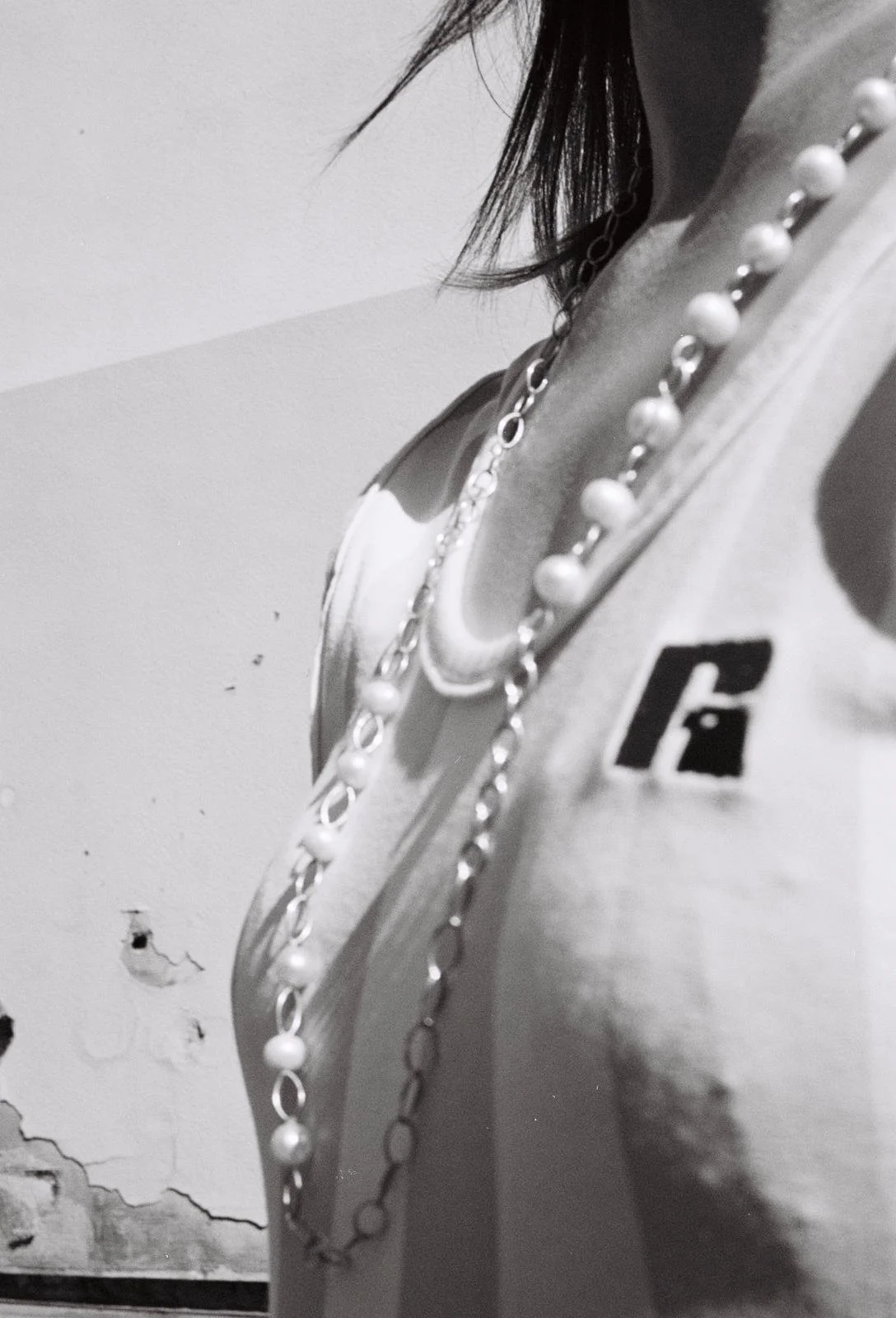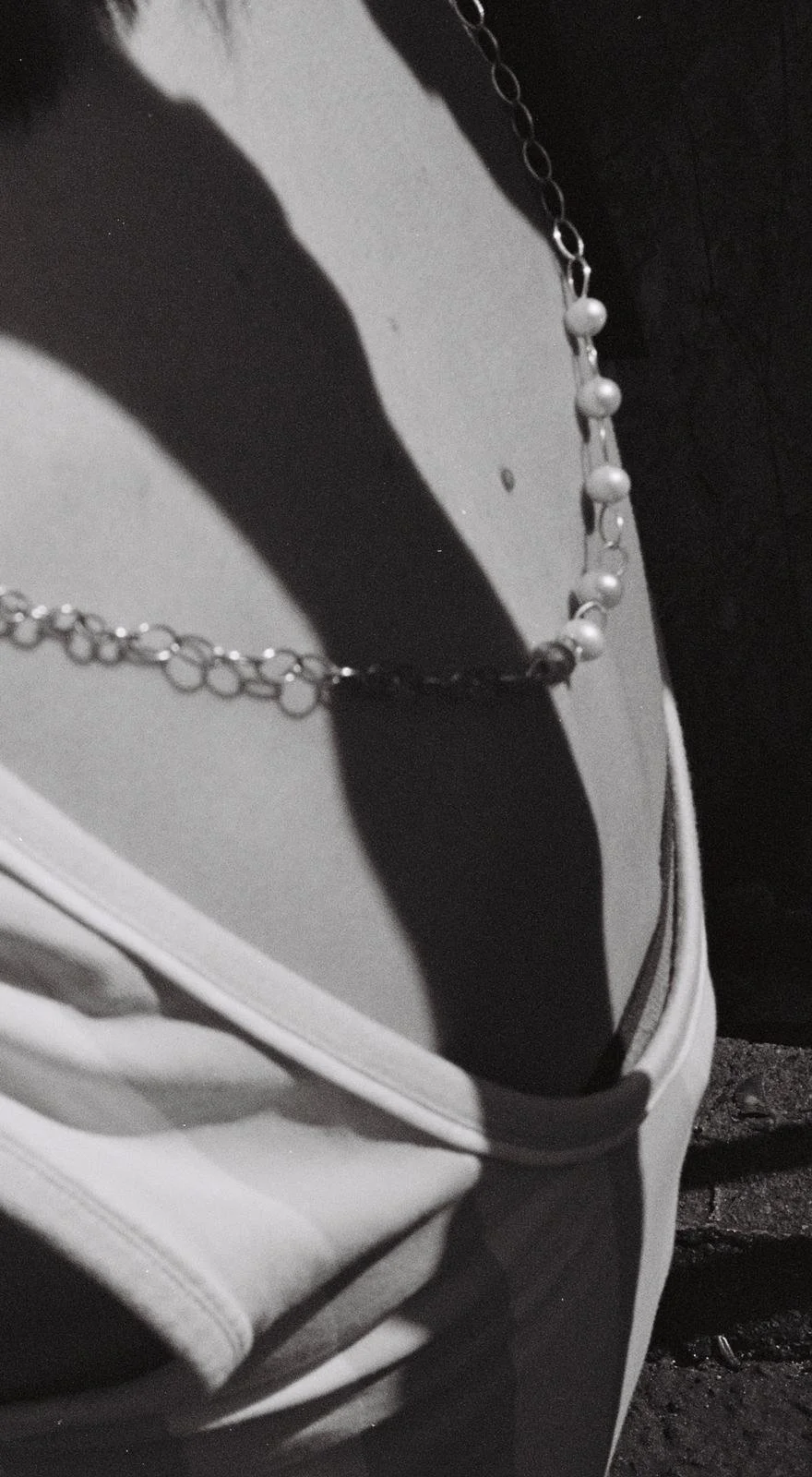 navette chain variation with different colored beads in white, orange and delicate rosé. the beads are connected by movable eyelets without closure